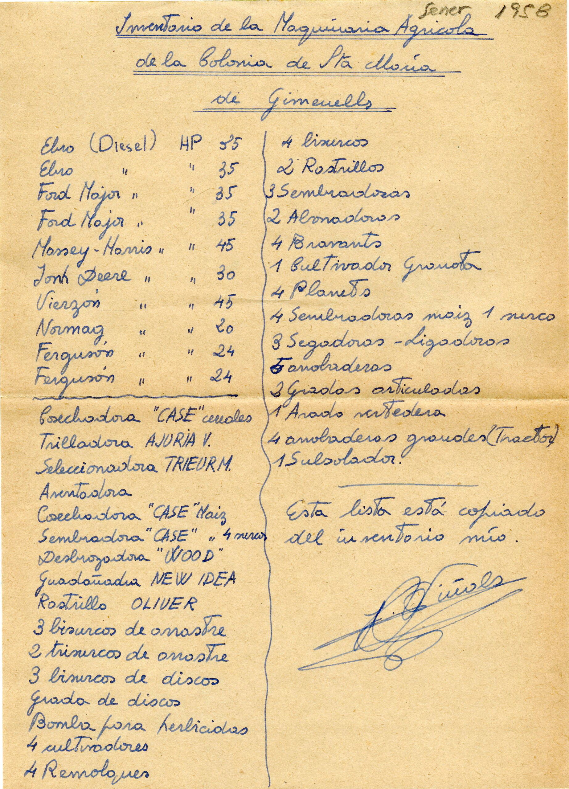 Sr. Vinyals : Inventari Maquinària de l’any 1958