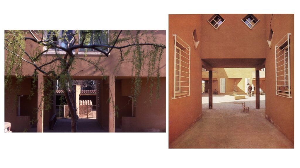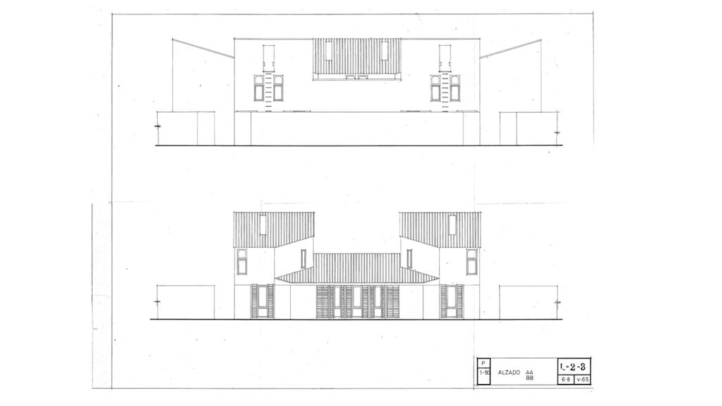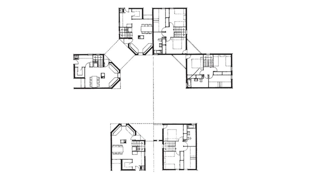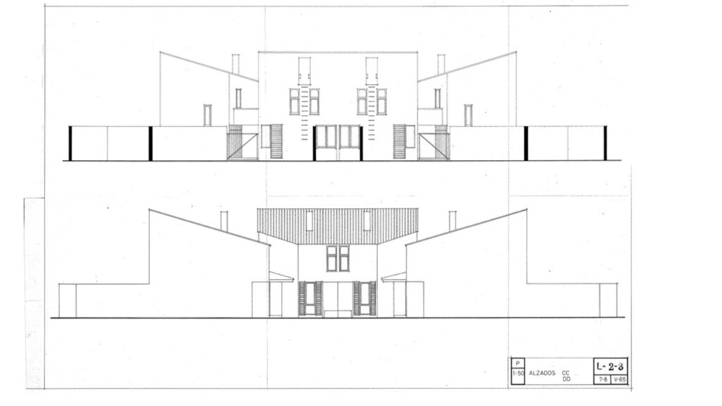 Es tracta d’una agrupació de sis habitatges situats enmig d’uns terrenys agrícoles, per ser habitats pels treballadors del camp. El projecte pren en consideració les formes d’agrupació de les construccions rurals, per la qual cosa forma agregats de volums de petites dimensions i evita la presència distorsionadora de les grans masses. Els habitatges s’agrupen de dos en dos constituint un esquema en T, de manera que al centre queda un espai semitancat que funciona com a espai de relació i com a punt d’accés a cada habitatge. Les construccions, de planta baixa més pis, adopten unes cantonades en bisell per reduir l’impacte volumètric dels cossos construïts. Les plantes primeres, destinades als dormitoris, agrupen cada paquet de dues plantes baixes, deixant uns passos coberts que permeten l’accés al jardí de cada habitatge. Els bisells, la col·locació de les obertures i les difraccions entre les plantes baixes i les plantes primeres tendeixen a fragmentar considerablement els volums i a evitar els panys de paret de grans dimensions. El conjunt forma un nucli construït a l’escala del paisatge de l’entorn i en consonància amb les tasques agrícoles a les quals serveix.