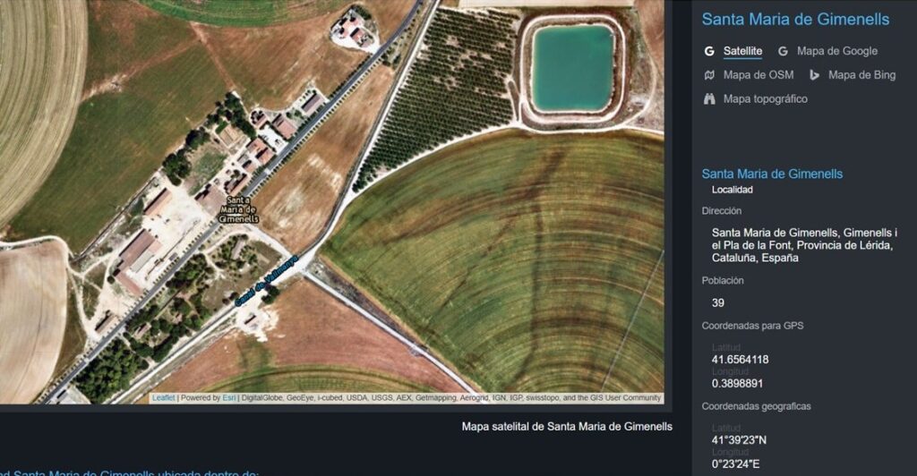 Santa Maria de Gimenells es localitza a 41° 39′ 22.03″ N, 0° 24′ 19.81″ E / 41.6561194, 0.4055028